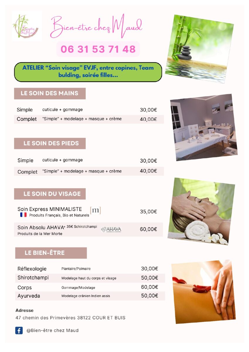 Mon institut « Bien-être chez Maud » a vu le jour en 2022, je vous y propose des soins visage, corps et mains avec des produits naturels et Français.